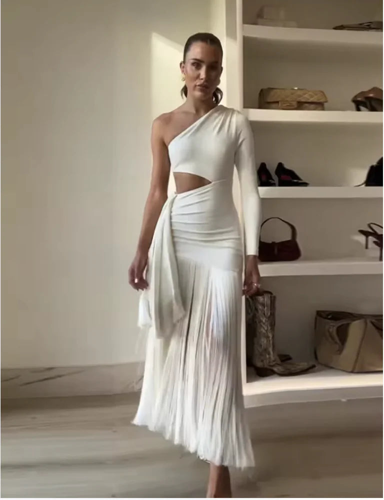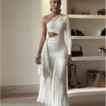 Eleva tu estilo con una pieza de moda que combina elegancia y comodidad en un solo diseño. Este vestido es el complemento perfecto para cualquier evento, ya sea un brunch, una fiesta en el jardín o una cena informal. Con su audaz diseño de un hombro, no solo llamará la atención, sino que también resaltará tu figura de manera sofisticada. La parte superior presenta una única tirante que acentúa tus hombros, mientras que el corte que descubre la cintura añade un toque atrevido, destacando tus curvas de forma natural.