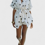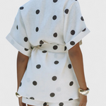 El conjunto Avila combina un top tipo kimono con lazo frontal y estampado de lunares, junto a shorts de cintura elástica y bolsillos, creando un look cómodo y alegre, ideal para días soleados.