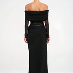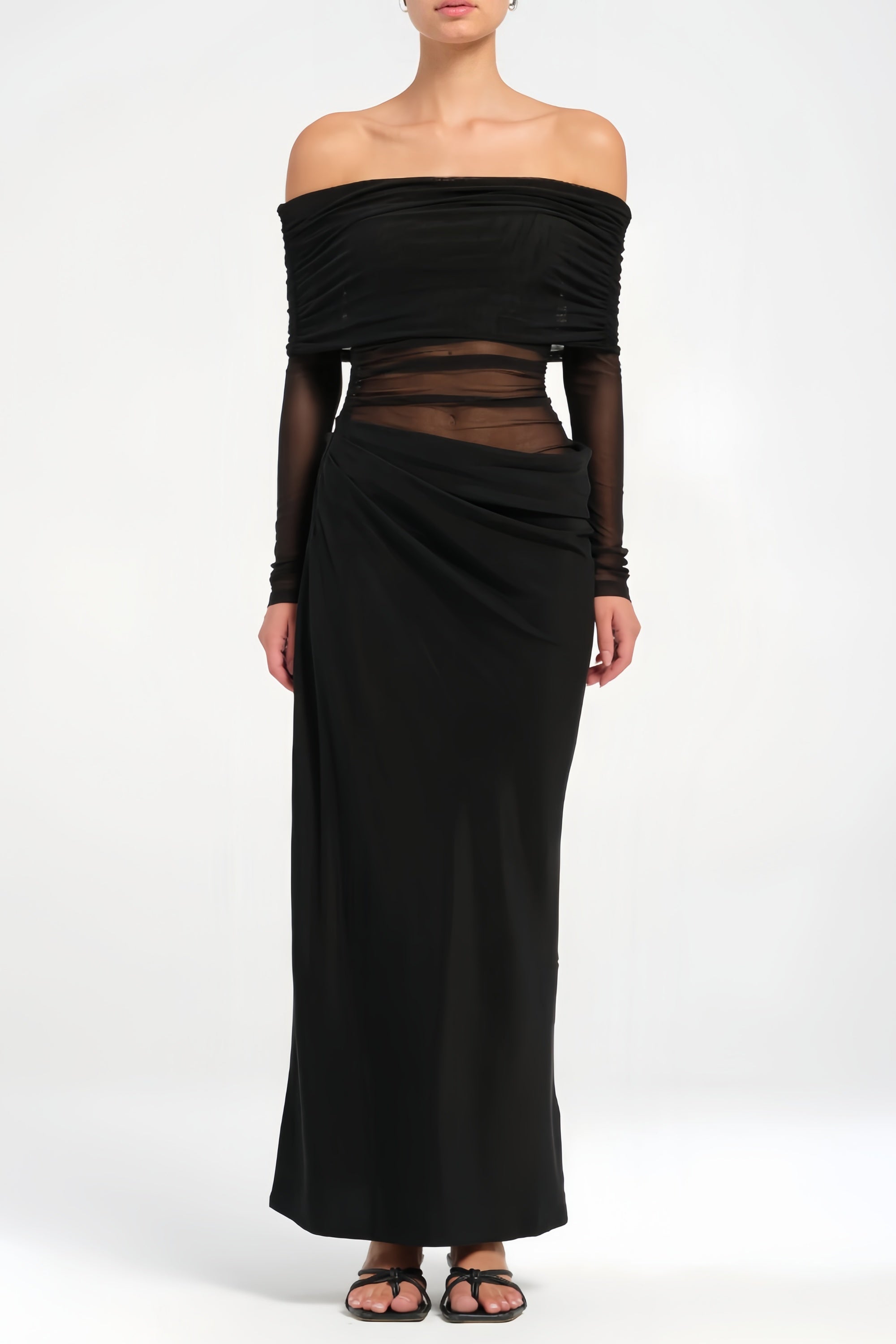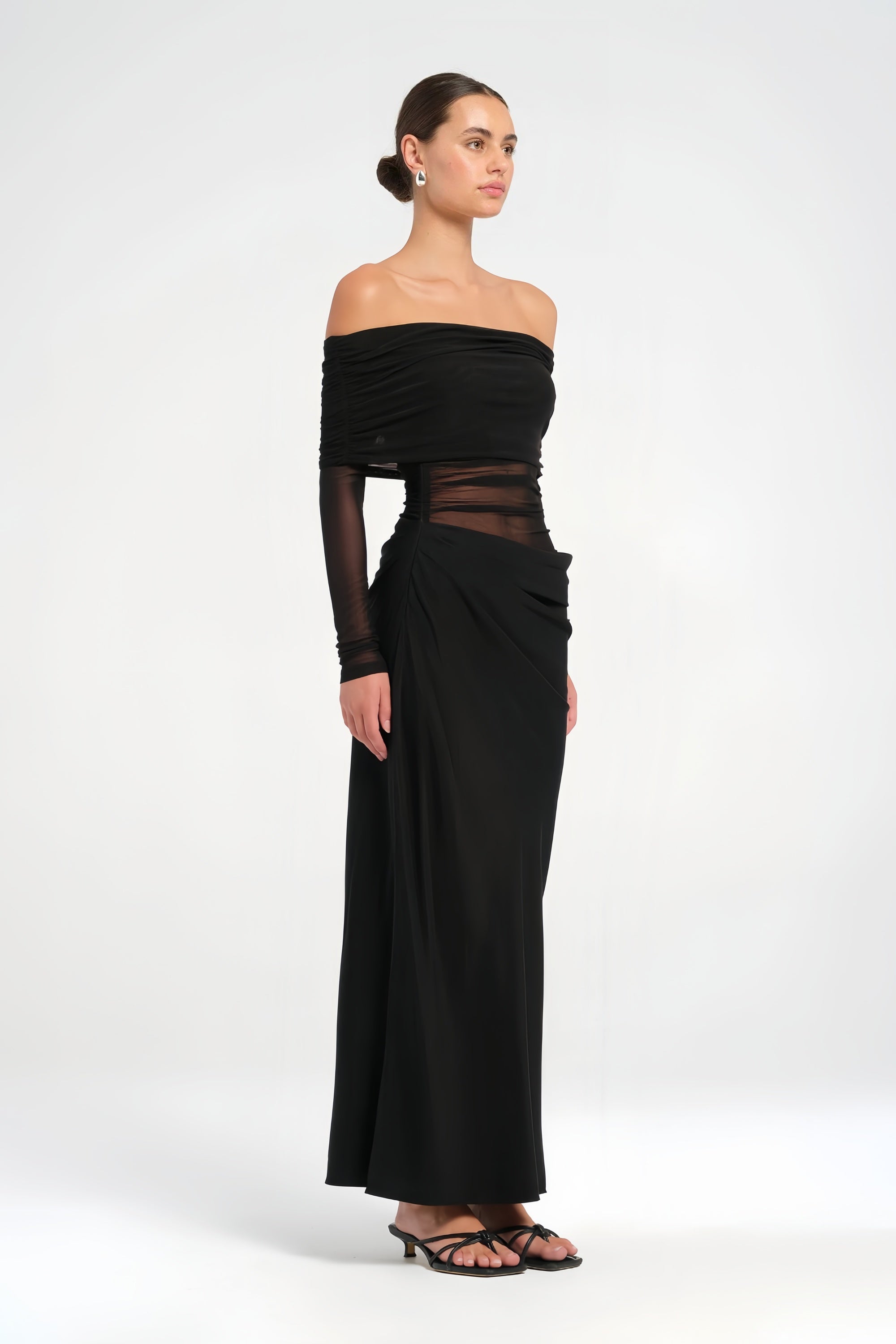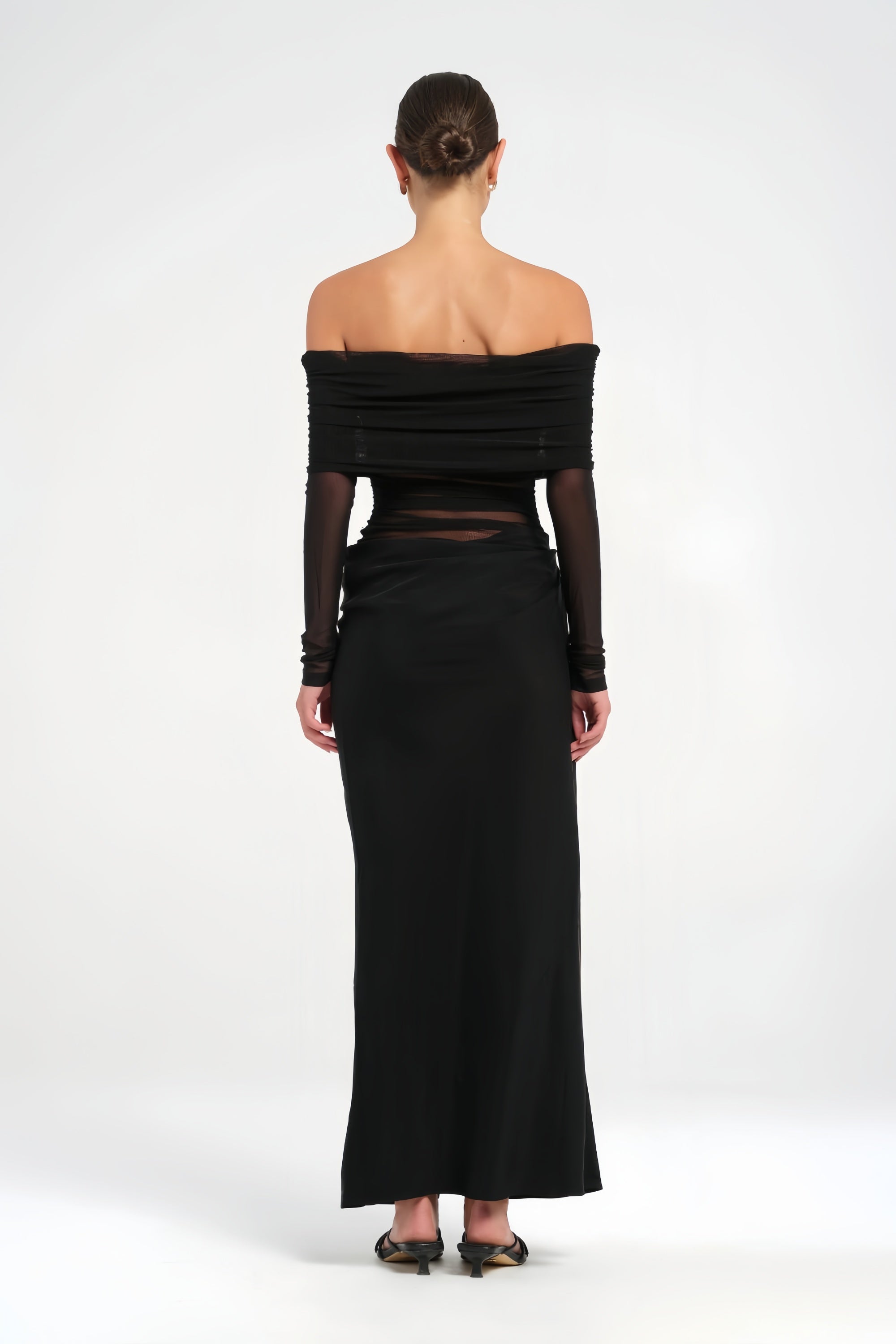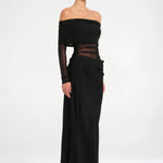 El vestido Estelle es una pieza etérea y sofisticada para noches inolvidables. El escote off-shoulder y las mangas largas semitransparentes crean un aire romántico y delicado, mientras los paneles de tul y los pliegues suaves realzan la silueta con gracia.