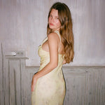 Descubre una pieza que evoca el encanto de épocas pasadas y que se convierte en un must-have para tu guardarropa. Este diseño cautivador, con tirantes delgados y una espalda descubierta, está confeccionado con un tejido ligero de poliéster que no solo garantiza durabilidad, sino también una comodidad excepcional. Su vibrante estampado amarillo no es solo un color; es una declaración de estilo, que irradia energía y calidez, convirtiéndote en el centro de atención en cada ocasión.